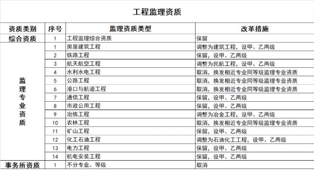 (四)工程監(jiān)理資質(zhì)。保留綜合資質(zhì)。取消水利水電工程、公路工程、港口與航道工程等專業(yè)資質(zhì),其資質(zhì)要求執(zhí)行有關(guān)行業(yè)主管部門規(guī)定。取消農(nóng)林工程監(jiān)理資質(zhì),建設(shè)單位委托農(nóng)林工程監(jiān)理業(yè)務(wù)時(shí),不再作資質(zhì)要求。上述4個(gè)監(jiān)理專業(yè)資質(zhì)取消后,相關(guān)企業(yè)可以換發(fā)相近專業(yè)同等級監(jiān)理專業(yè)資質(zhì)。監(jiān)理專業(yè)資質(zhì)等級壓減為甲、乙兩級,原丙級資質(zhì)并入相應(yīng)專業(yè)的乙級資質(zhì)。取消事務(wù)所資質(zhì)。