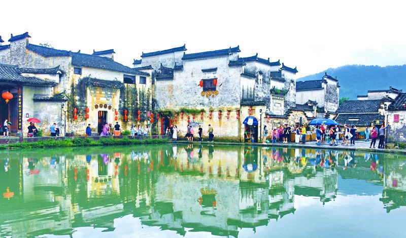 資料照片:游客在黃山市黟縣宏村月沼游玩。 記者 潘成 攝