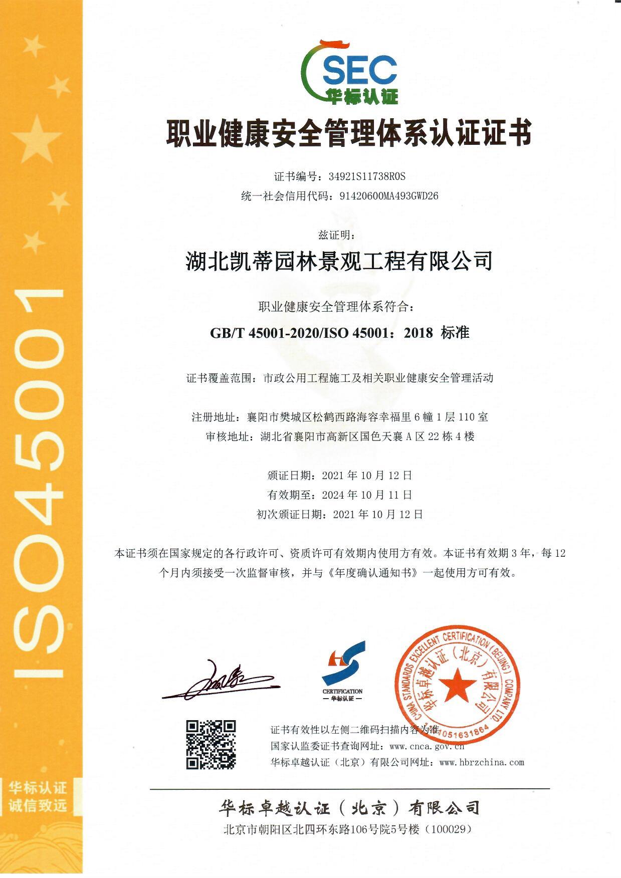ISO45001職業健康安全管理體系認證證書